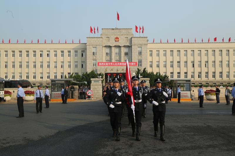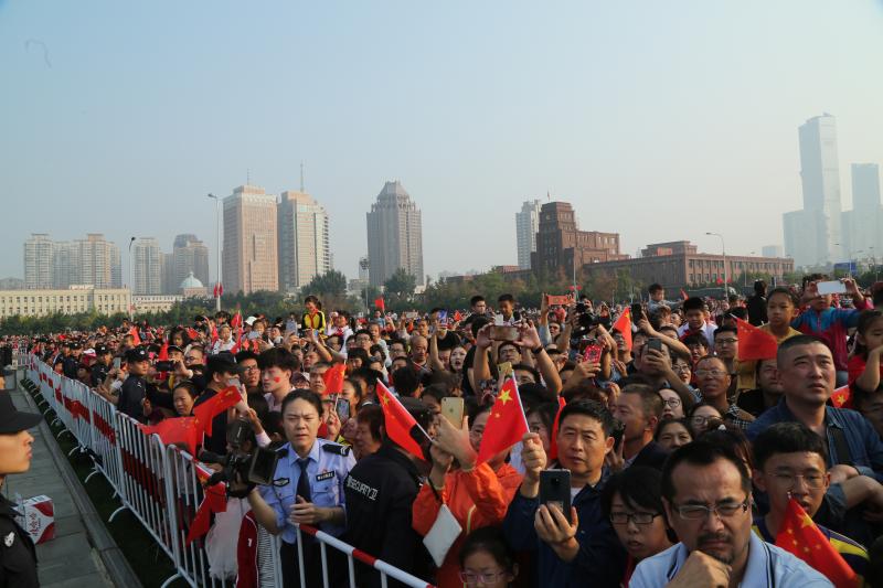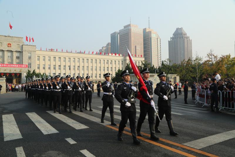 7点50分,担任今天升旗及护卫任务的辽宁警察学院53名教官和学员从市政府南门列队行进而出,他们英姿飒爽、身姿挺拔、步伐划一,护卫着国旗从市政府南门向人民广场行进途中,围拢在四周的市民不断发出欢呼声,不少市民激动地高呼:“祖国万岁!”