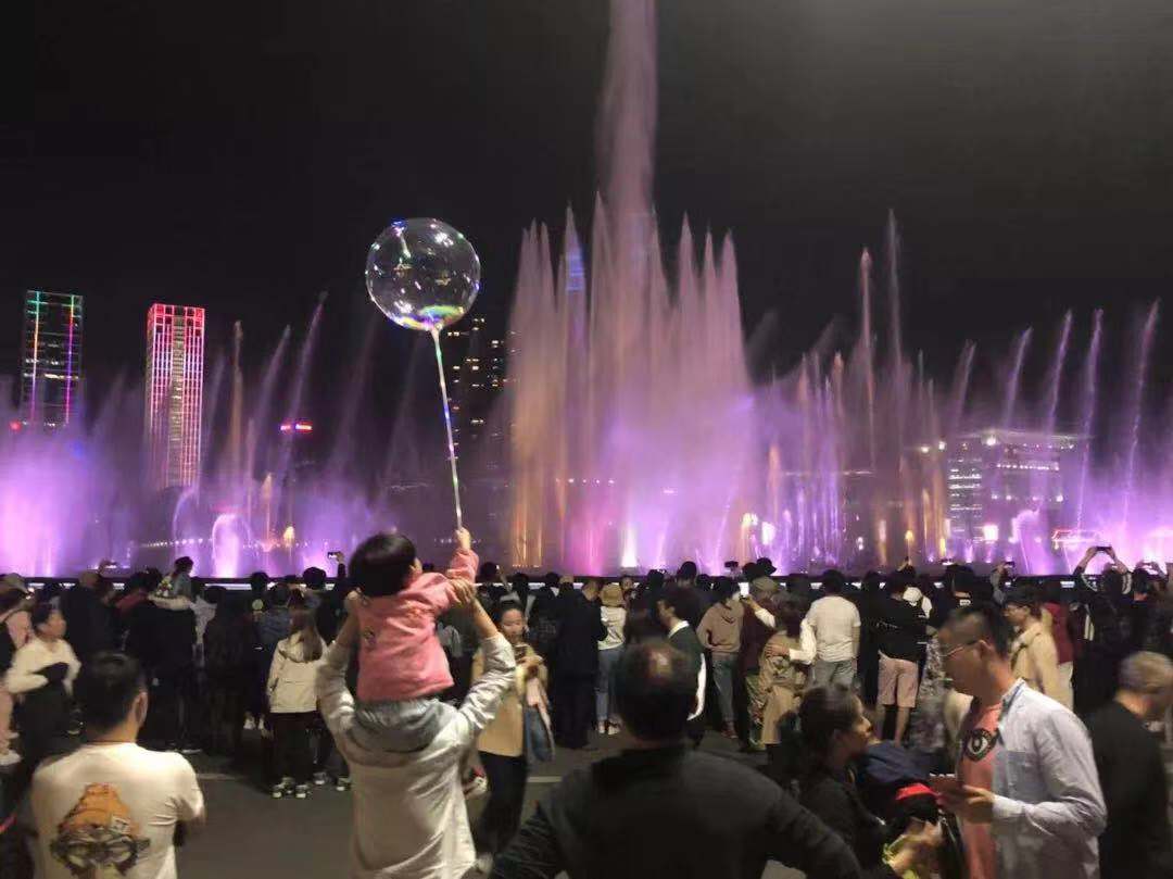 星海广场音乐喷泉已然成为市民游客观赏的必到打卡地,喷泉表演前,市民游客便早早地来到了观赏区域,静静等候喷泉开启带来的震撼体验。国庆节期间,星海广场音乐喷泉还加喷一场,每天提前30分钟进行表演,即18:30、19:00、19:30三个时段表演,10种水型与音乐此起彼伏,形态万千,在声、光、电、火等元素配合下,呈现变幻多彩、气势恢弘的效果,映衬滨城夜空下的绝美景观。每晚,前来观看广场音乐喷泉表演的游客人头攒动、流连忘返,在《歌唱祖国》《我和我的祖国》《我爱你中国》等歌曲的播放中合声高歌,尽情地释放着对祖国的热爱和祝福情怀。