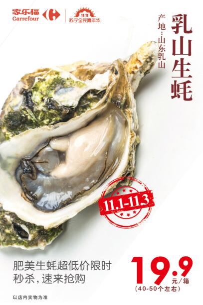 家乐福中国首战苏宁双十一,推出生鲜爆品超值活动,产地直采、品质独特的乳山生蚝是主推品之一。个头大、肉质饱满、入口爽滑、汁液鲜美,规格2.25kg-2.5kg、原价29.9元/箱的乳山生蚝,“开门红”三天直降至19.9元/箱,最实惠的“蚝”门盛宴只等安排。