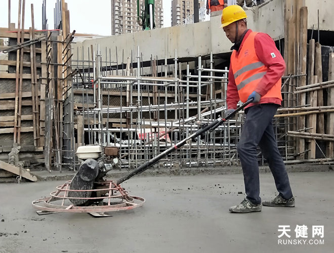 施工人员使用地面磨光机对水泥地面进行磨光