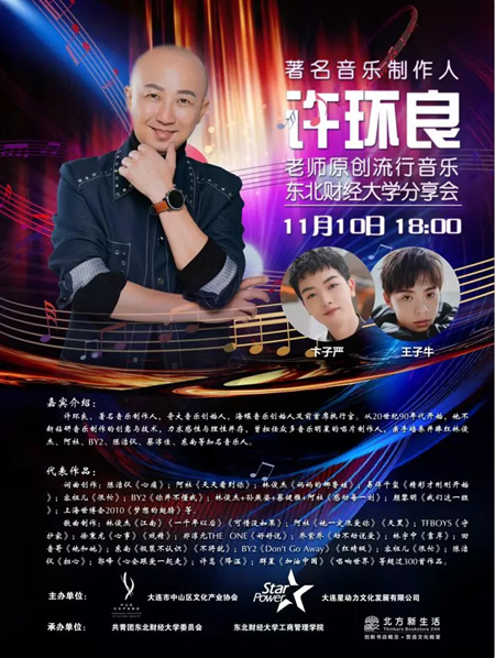 11月10日,由大连市中山区文化产业协会、星动力文化联合奇大音乐共同主办的“少年敢追梦,是最美好的冲动”音乐大师许环良分享会将分别在“盛文·北方新生活”大连24小时书店和东北财经大学举办。届时,许环良将协同两位奇大练习生亲临现场与大家见面。他对音乐艺术性与商业性的平衡,往往精准有力。而对艺人的选择,他更有自己的严格标准。从上个世纪90年代开始,他不断地将艺术与商业融合,让感性与理性并存。