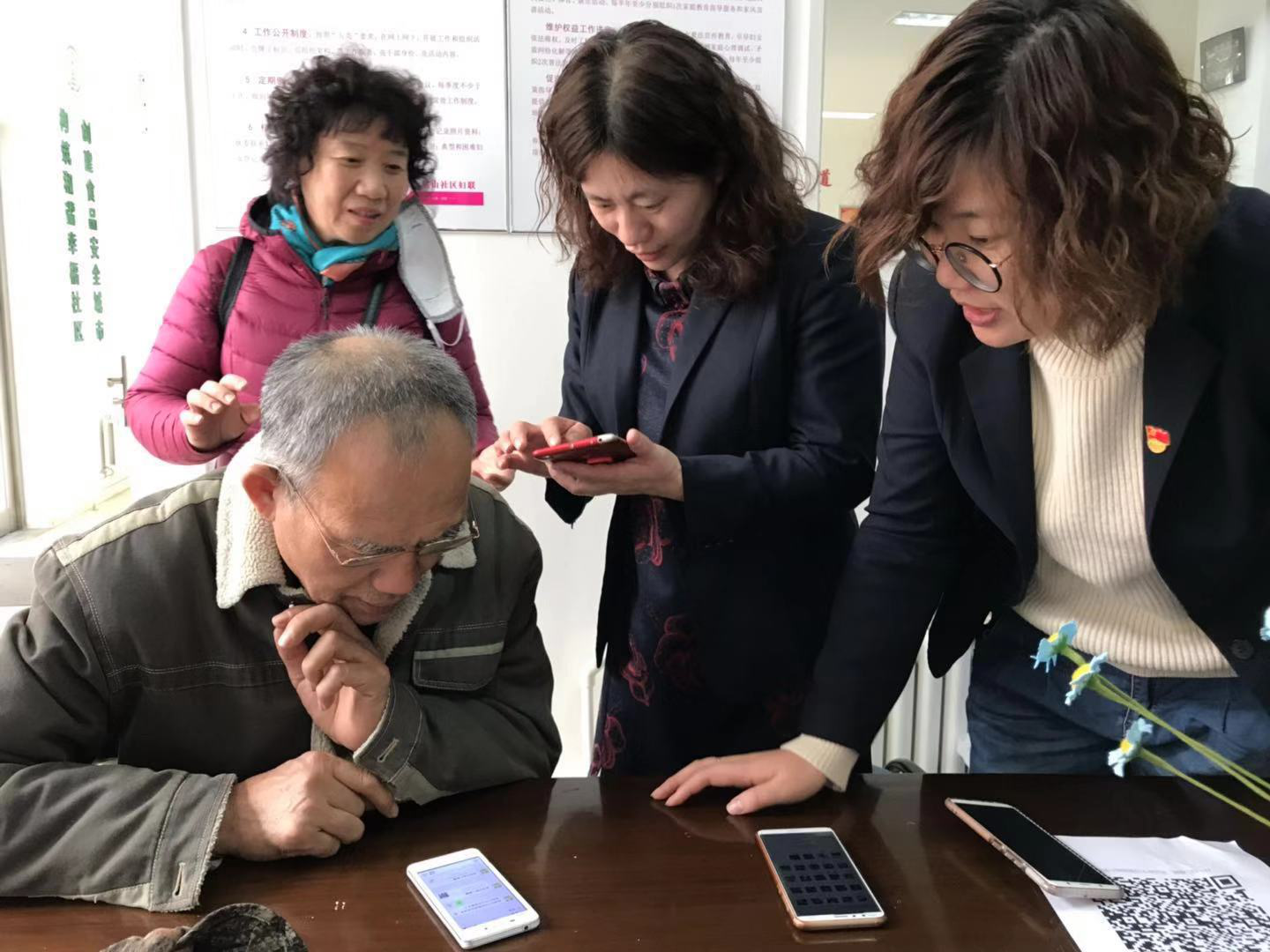 工作人员主动帮助不会使用智能手机的老党员下载“学习强国”学习平台,并为他们讲解学习平台的使用方法。