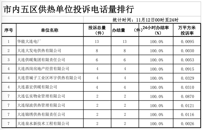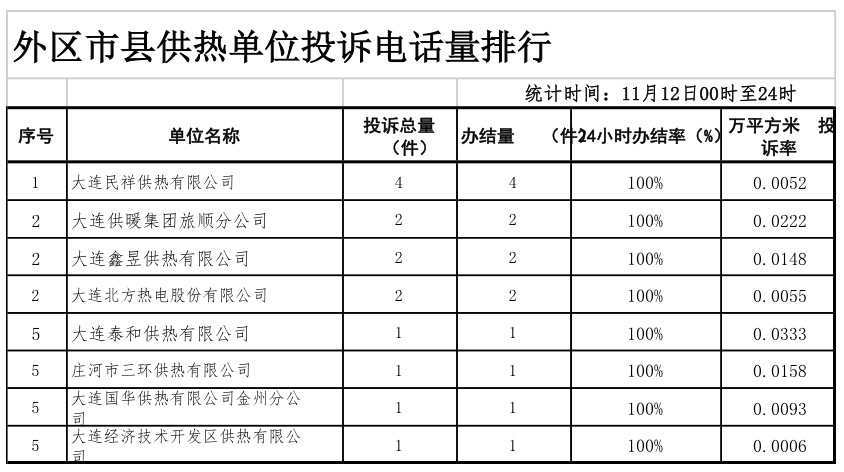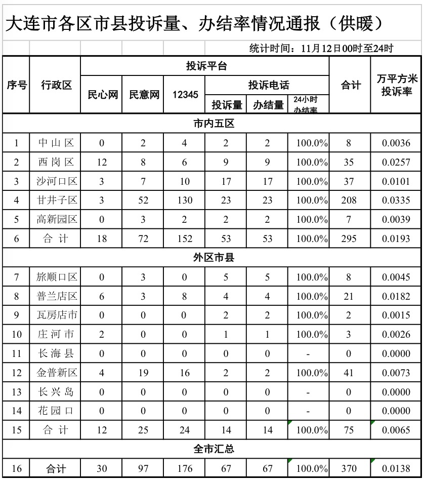 天健网消息(记者 丁一)11月13日,市住建局公布11月12日0时至24时市内五区及外区市县来自民心网、民意网、12345、投诉电话等渠道的供暖投诉量、办结率相关数据,数据显示,该时段全市范围内共接到投诉370件。