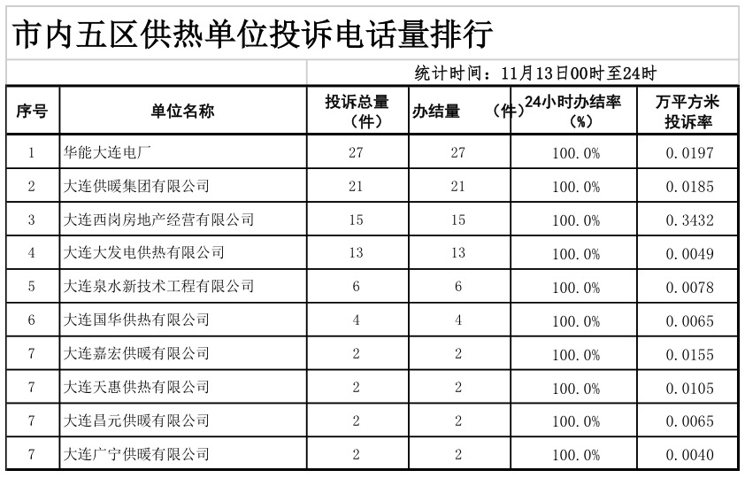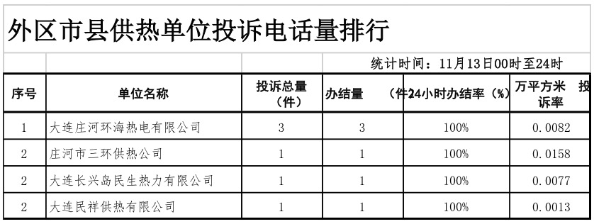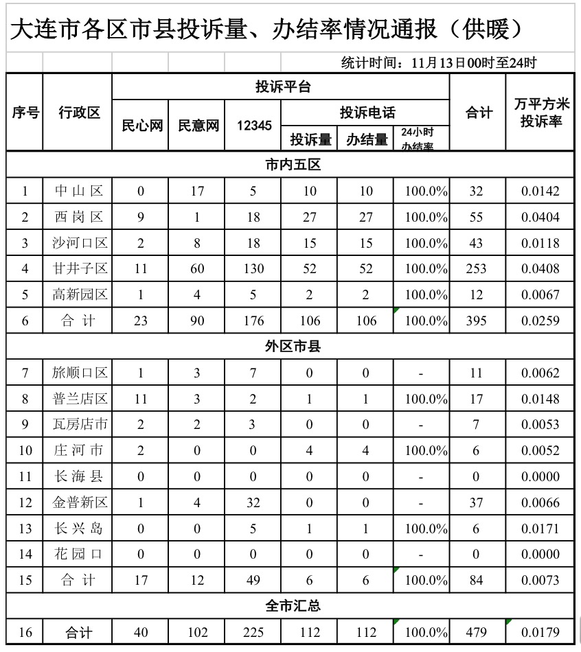 天健网消息(记者 丁一)11月14日,市住建局公布11月13日0时至24时市内五区及外区市县来自民心网、民意网、12345、投诉电话等渠道的供暖投诉量、办结率相关数据,数据显示,该时段全市范围内共接到投诉479件。