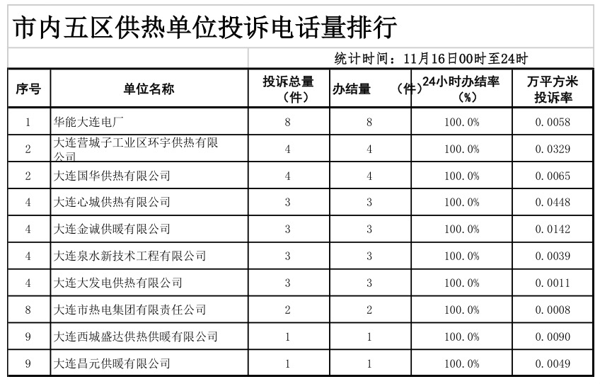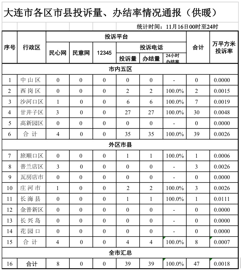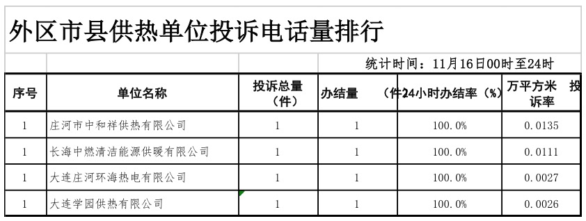 天健网消息(记者 丁一)11月17日,市住建局公布11月16日0时至24时市内五区及外区市县来自民心网、民意网、12345、投诉电话等渠道的供暖投诉量、办结率相关数据,数据显示,该时段全市范围内供暖投诉量大幅度下降,共接到投诉47件。