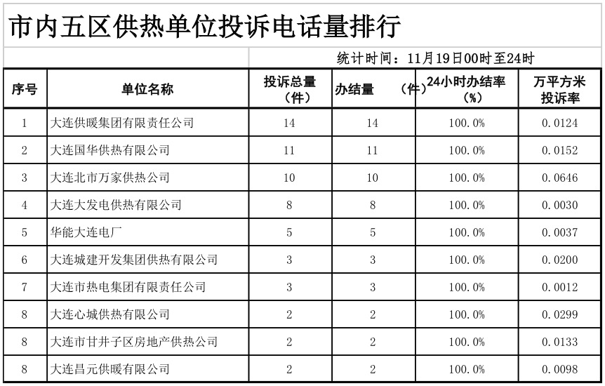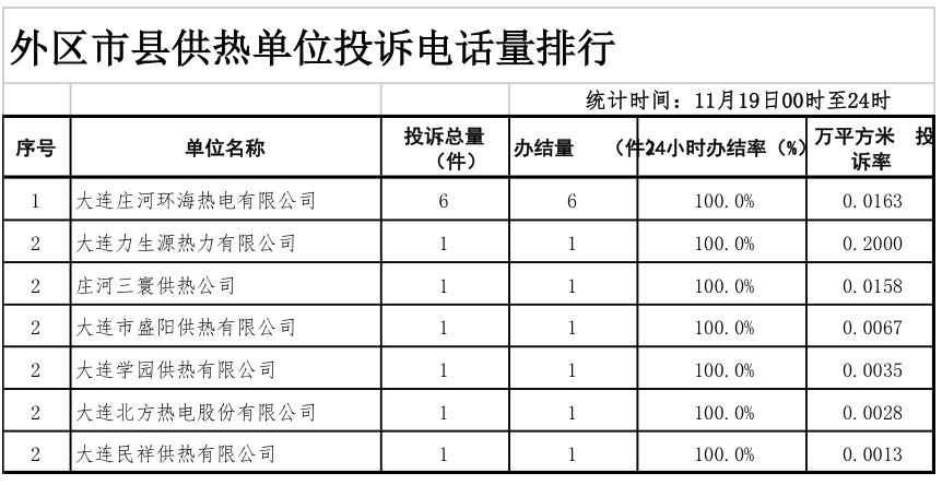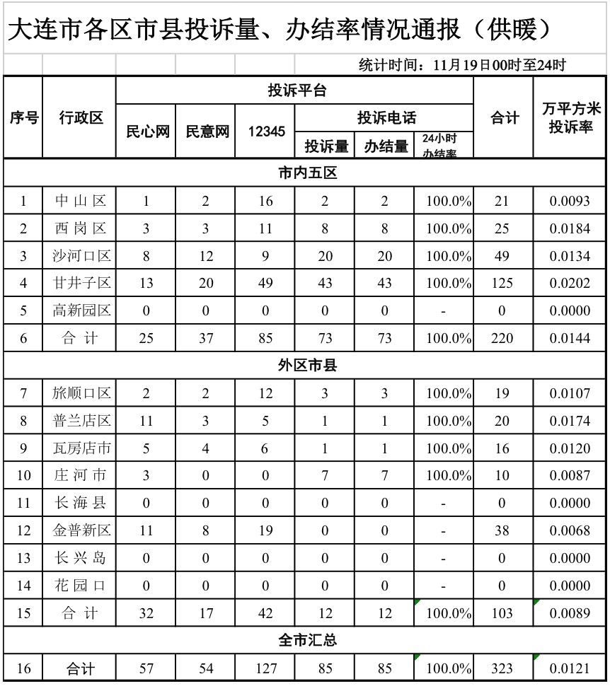 天健网消息(记者 丁一)11月20日,市住建局公布11月19日0时至24时市内五区及外区市县来自民心网、民意网、12345、投诉电话等渠道的供暖投诉量、办结率相关数据,数据显示,该时段全市范围内共接到供暖投诉323件。