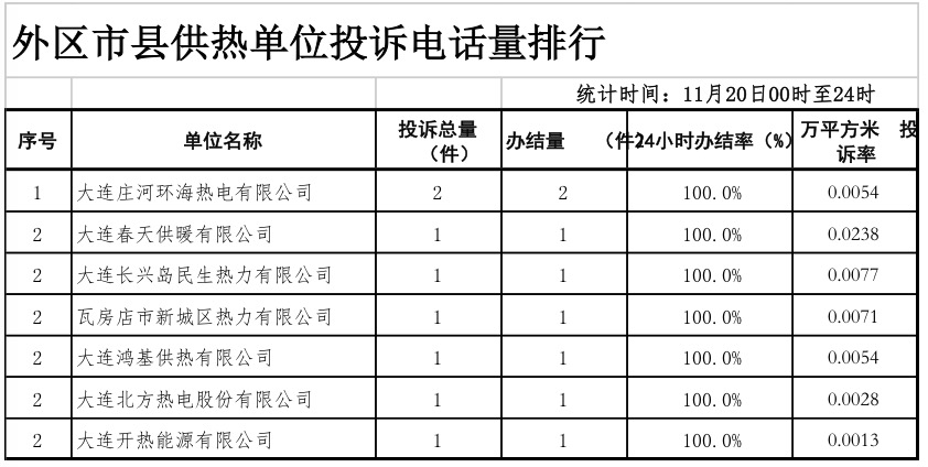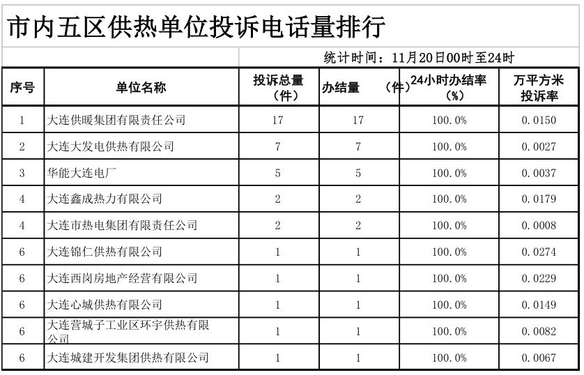 天健网消息(记者 丁一)11月21日,市住建局公布11月20日0时至24时市内五区及外区市县来自民心网、民意网、12345、投诉电话等渠道的供暖投诉量、办结率相关数据,数据显示,该时段全市范围内共接到供暖投诉276件。