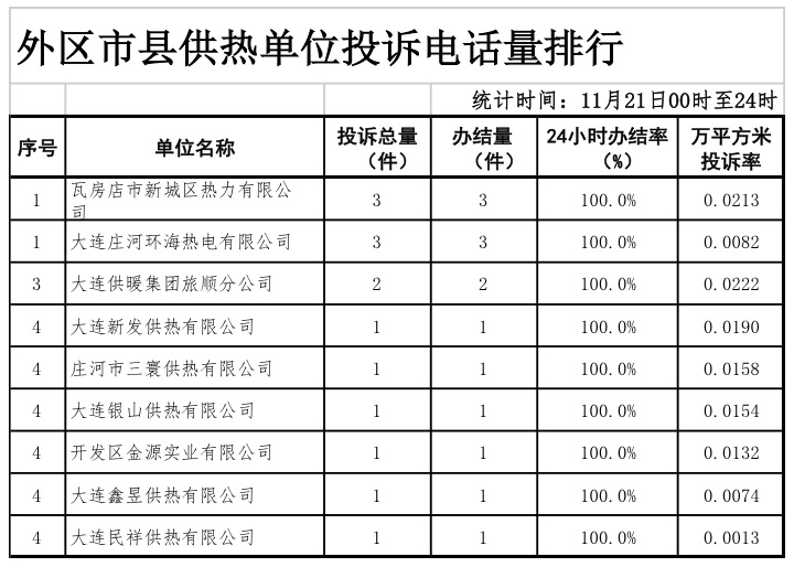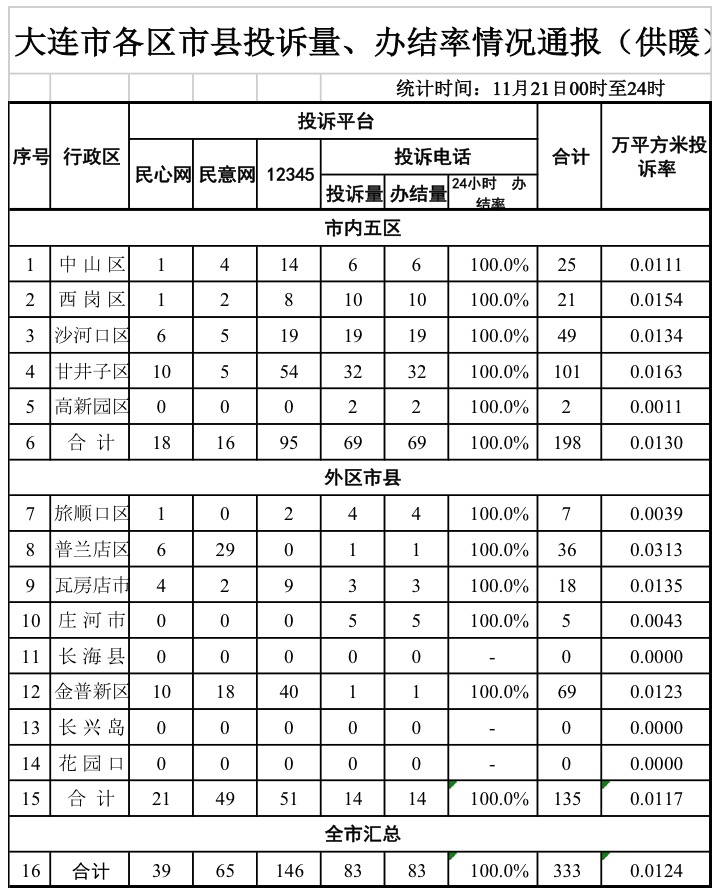 天健网消息(记者 丁一)11月22日,市住建局公布11月21日0时至24时市内五区及外区市县来自民心网、民意网、12345、投诉电话等渠道的供暖投诉量、办结率相关数据,数据显示,该时段全市范围内共接到供暖投诉333件。