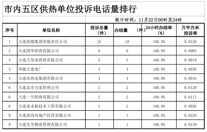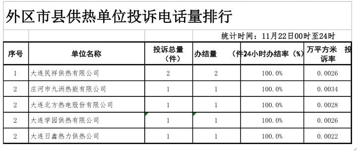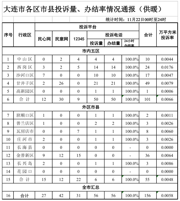 天健网消息(记者 丁一)11月23日,市住建局公布11月22日0时至24时市内五区及外区市县来自民心网、民意网、12345、投诉电话等渠道的供暖投诉量、办结率相关数据,数据显示,该时段全市范围内共接到供暖投诉156件。