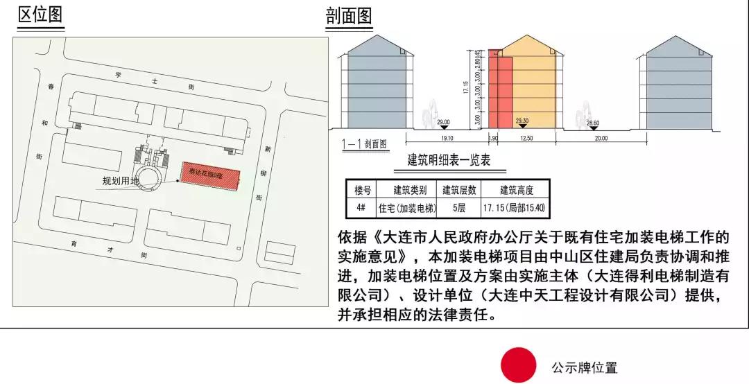依据《大连市人民政府关于既有住宅加装电梯工作的实施意见》,项目由中山区住建局负责协调推进,加装电梯位置及方案由实施主体(大连得利电梯制造有限公司)、设计单位(大连中天工程设计有限公司)提供,并承担相应的法律责任。