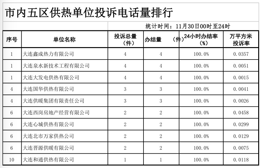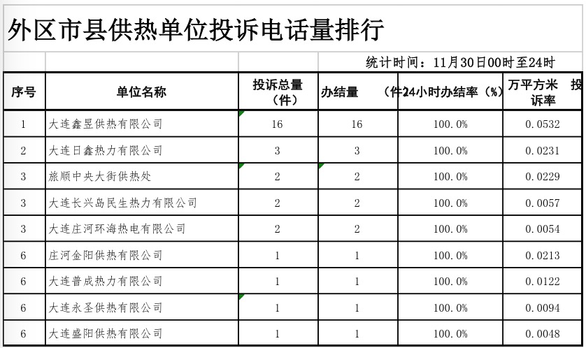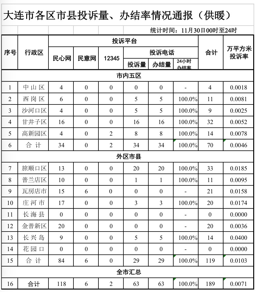 天健网消息(记者 丁一)12月1日,市住建局公布11月30日0时至24时市内五区及外区市县来自民心网、民意网、12345、投诉电话等渠道的供暖投诉量、办结率相关数据,数据显示,该时段全市范围内共接到供暖投诉189件。