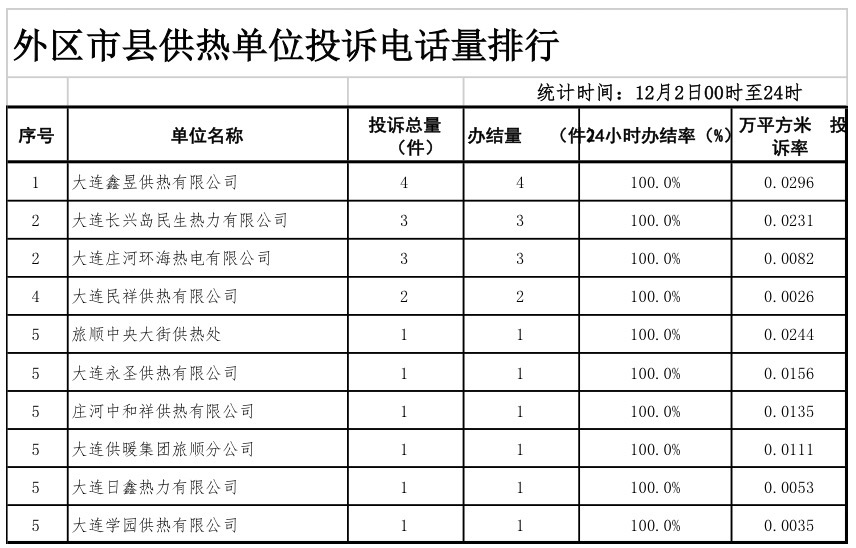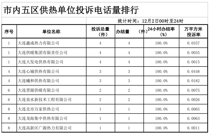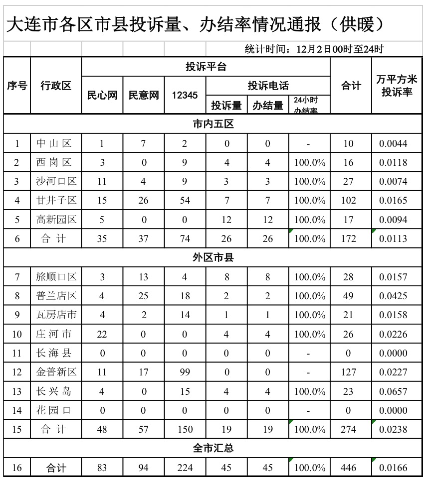 天健网消息(记者 丁一)12月3日,市住建局公布12月2日0时至24时市内五区及外区市县来自民心网、民意网、12345、投诉电话等渠道的供暖投诉量、办结率相关数据,数据显示,该时段全市范围内共接到供暖投诉446件。