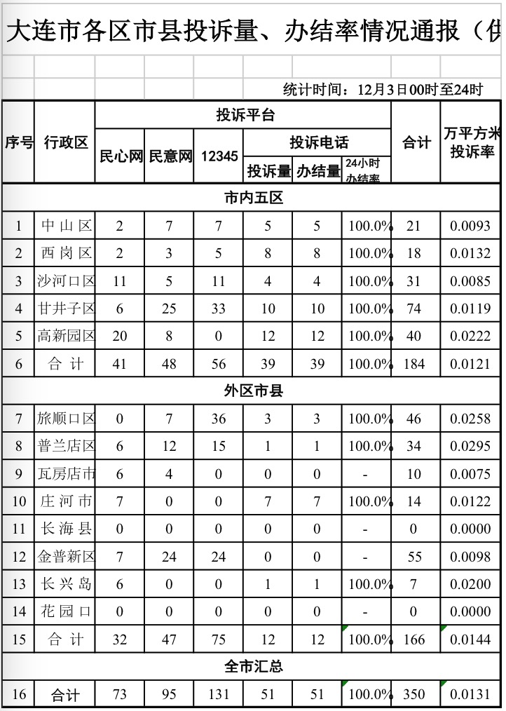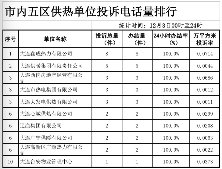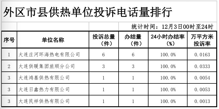 天健网消息(记者 丁一)12月4日,市住建局公布12月3日0时至24时市内五区及外区市县来自民心网、民意网、12345、投诉电话等渠道的供暖投诉量、办结率相关数据,数据显示,该时段全市范围内共接到供暖投诉350件。