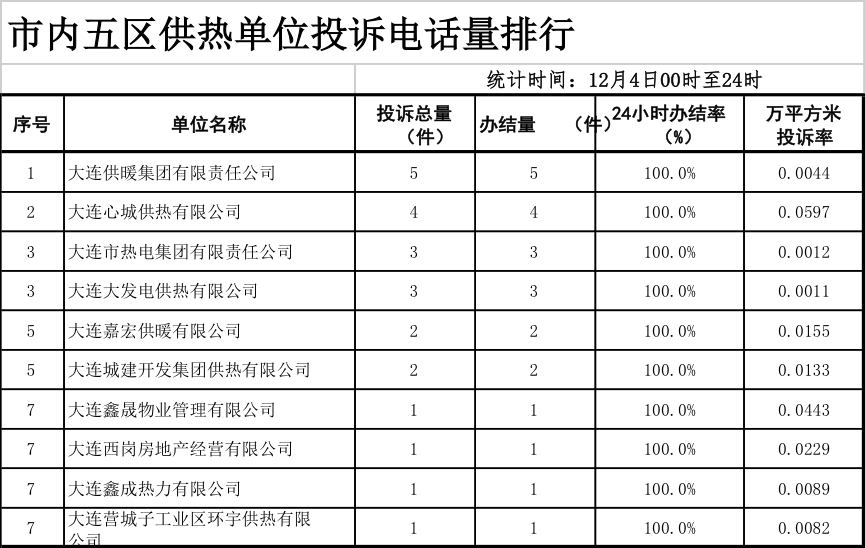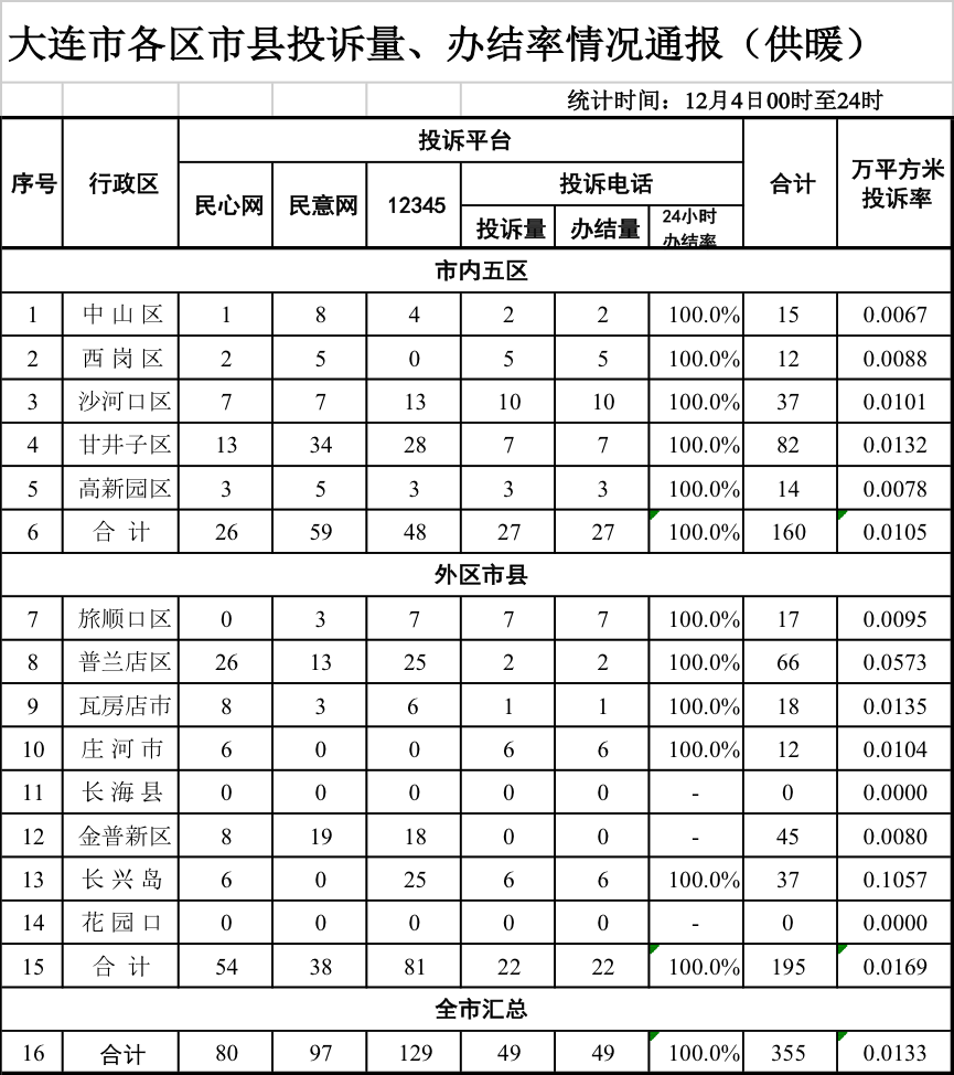 天健网消息(记者 丁一)12月5日,市住建局公布12月4日0时至24时市内五区及外区市县来自民心网、民意网、12345、投诉电话等渠道的供暖投诉量、办结率相关数据,数据显示,该时段全市范围内共接到供暖投诉355件。