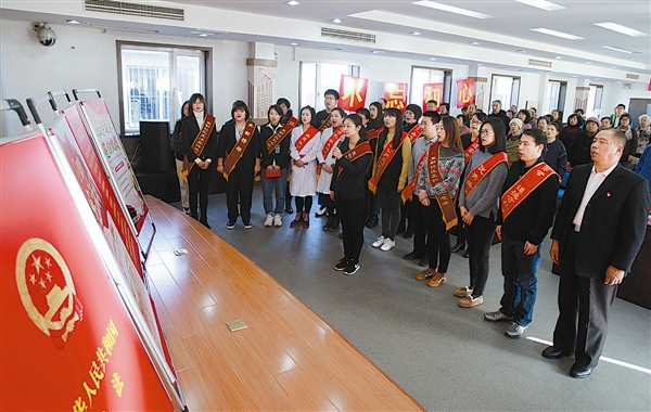 12月5日,西岗区日新街道更新社区携手日新司法所开展了“弘扬宪法精神,争做守法公民”主题活动。活动中,特邀公安干警、检察官、法官和律师等专家学者与居民面对面,一起学习宪法,并面对国徽诵读宪法,以宪法精神凝心聚力,大力弘扬和传播法制正能量。图为居民面对国徽诵读宪法。本报记者王华 摄