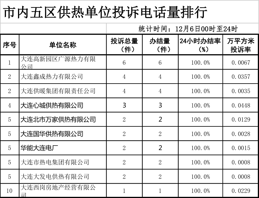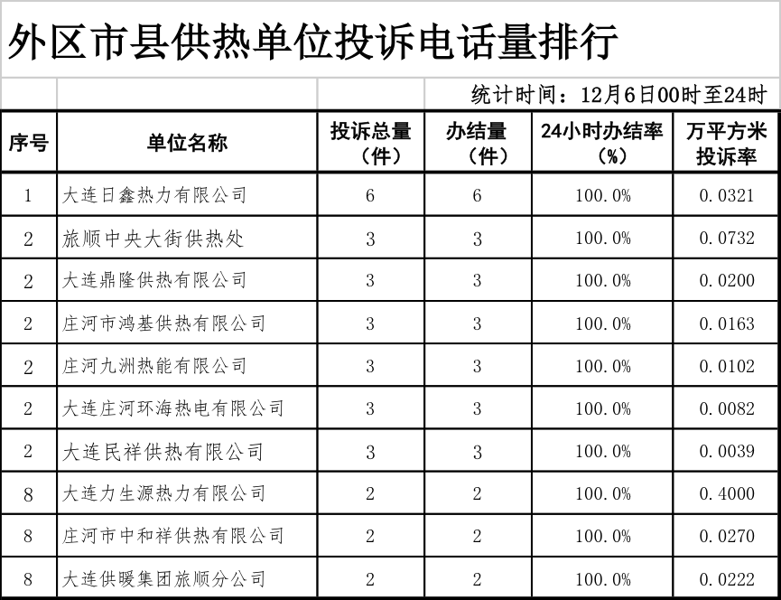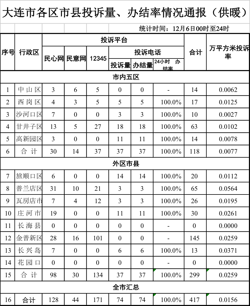 天健网消息(记者 丁一)12月7日,市住建局公布12月6日0时至24时市内五区及外区市县来自民心网、民意网、12345、投诉电话等渠道的供暖投诉量、办结率相关数据,数据显示,该时段全市范围内共接到供暖投诉417件。