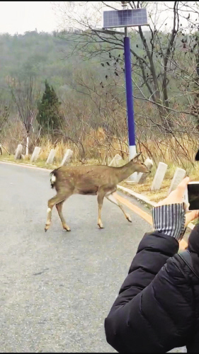 12月9日,记者联系上了这段视频的拍摄者彭志,小彭表示,视频拍摄于12月8日10点多。“当时我和朋友到滨海路上徒步散心,在行进到西山揽胜景区附近时,突然看到一头‘萌萌哒’的小鹿从滨海路北侧的山林中冒出头来。”小鹿现身时,这段路上行人不少。但小家伙对人类并无戒心,先是溜溜达达地靠近路边,然后趁没有车辆经过时,撒开四蹄跑到了路面上,随后“横穿马路”跳进了滨海路南侧的山林里。“这只是一头‘先头鹿’,之后接连不断地跳出来小鹿,它们都很大方地穿过滨海路,从北向南一路‘撒欢’。”小彭说,先后有十多头鹿穿过滨海路,持续时间长达1分30秒。“闻讯赶来拍照的人也有不少,这期间有司机驾车经过此地,都能主动停车避让,让小家伙们先穿过马路。”