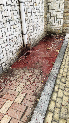 昨日中午,记者来到了金柳路附近的我爱我家小区,在该小区15号楼附近,记者见到,虽然下着雨,但地面上很多血污清晰可见,有的地方被雨水冲刷成了红色,甚至有一股腥味。