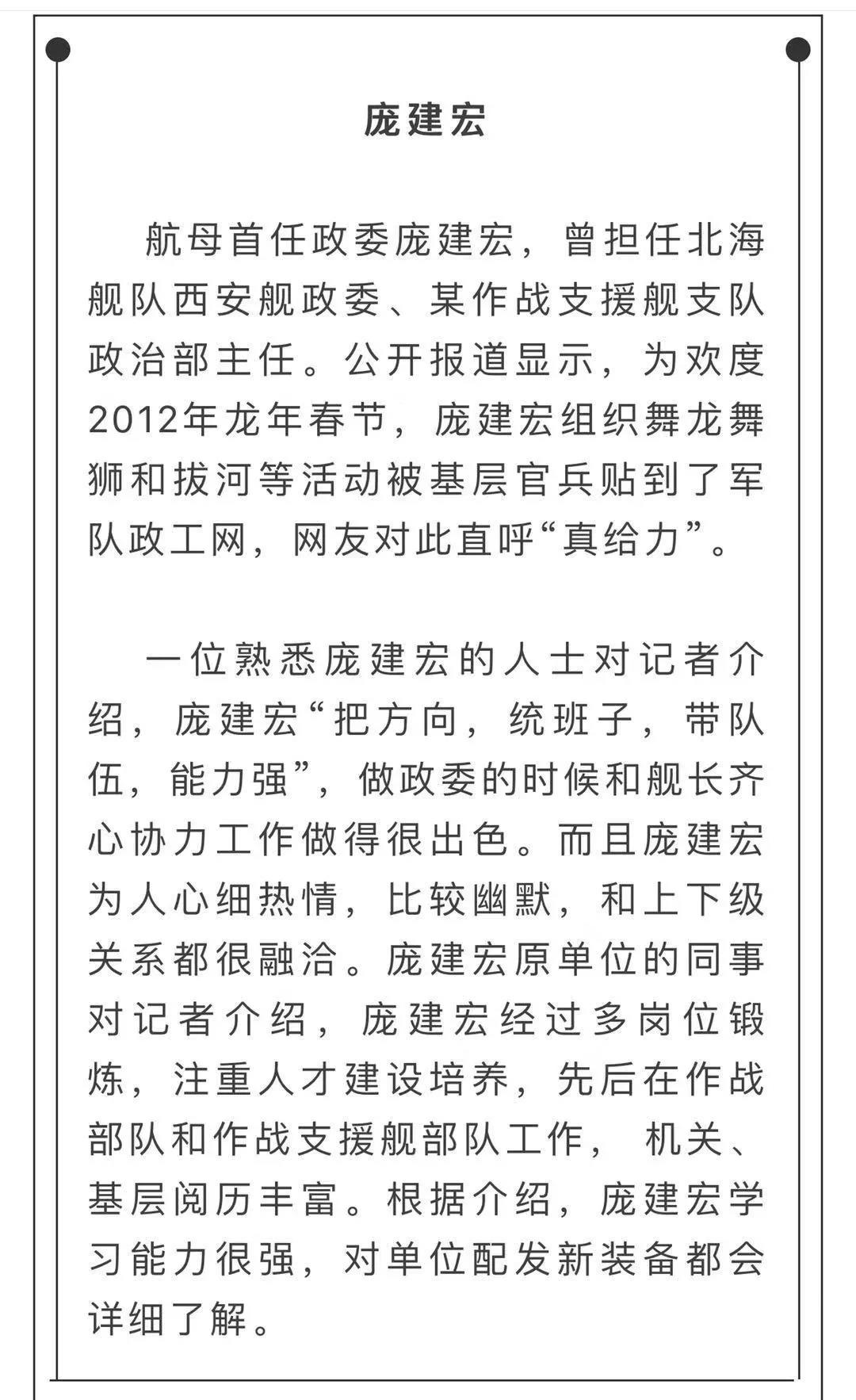在新闻联播的画面中,佩戴大校军衔的来奕军被介绍为山东舰舰长,佩戴大校军衔的庞建宏被介绍为山东舰政治委员。