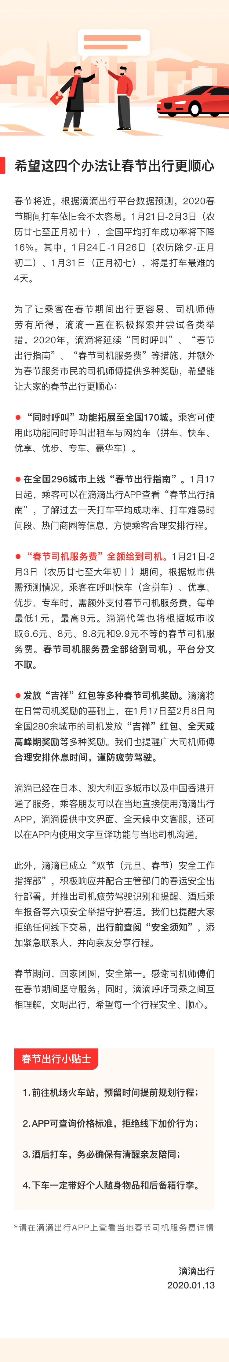 为缓解节假日供需矛盾,滴滴公布包括“同时呼叫”“春节出行指南”、“春节司机服务费”、“定制春节补贴”四大措施。滴滴此前曾尝试在春节试行“同时呼叫”、“春节出行指南”“春节司机服务费”等措施。通过以上三种措施,2019年滴滴春节打车成功率稳定在66.02%。今年,滴滴将“同时呼叫”功能拓展至全国170城。“春节出行指南”也将在全国296城上线。滴滴“春节司机服务费”最低1元,最高不超9元,全额给到司机。