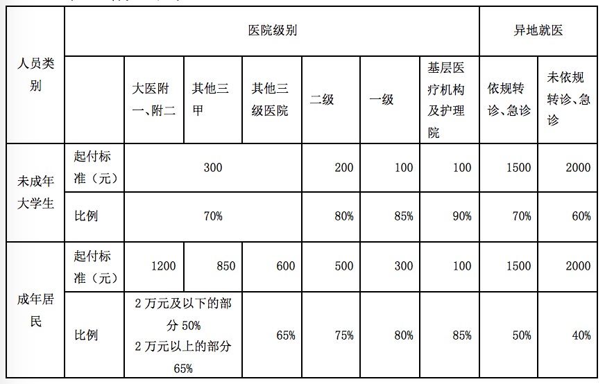 城乡居民基本医疗保险参保人员住院发生的支付范围内医疗费用,实行起付标准和年度最高支付限额,起付标准以内的医疗费用,由个人承担;起付标准以上、年度最高支付限额以下的医疗费用,由统筹基金按照一定比例支付。未成年居民、大学生年度最高支付限额为20万元;成年居民年度最高支付限额为15万元。