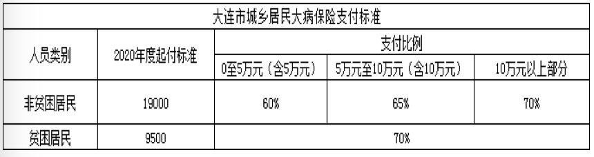 2020年大连市城乡居民医保大病保险起付标准为1.9万元。起付标准以上的个人负担合规医疗费用,在0至5万元(含5万元)的部分,大病保险按60%理赔; 在5万元至10万元(含10万元)的部分,大病保险按65%理赔; 在10万元以上的部分,大病保险按70%理赔。