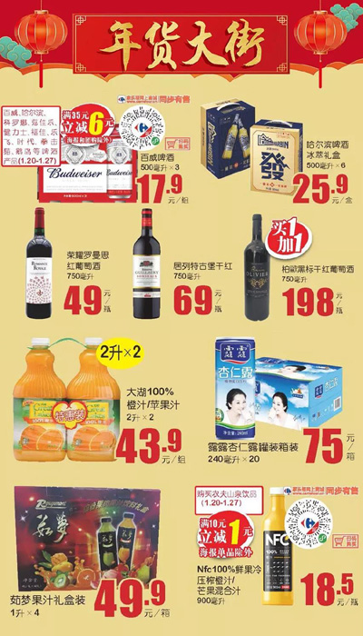 春节聚会加点肉,有鱼有肉有年味,走亲访友带着礼,有钱有财有面子,家乐福向您发福利,满减!立减!你赚啦!