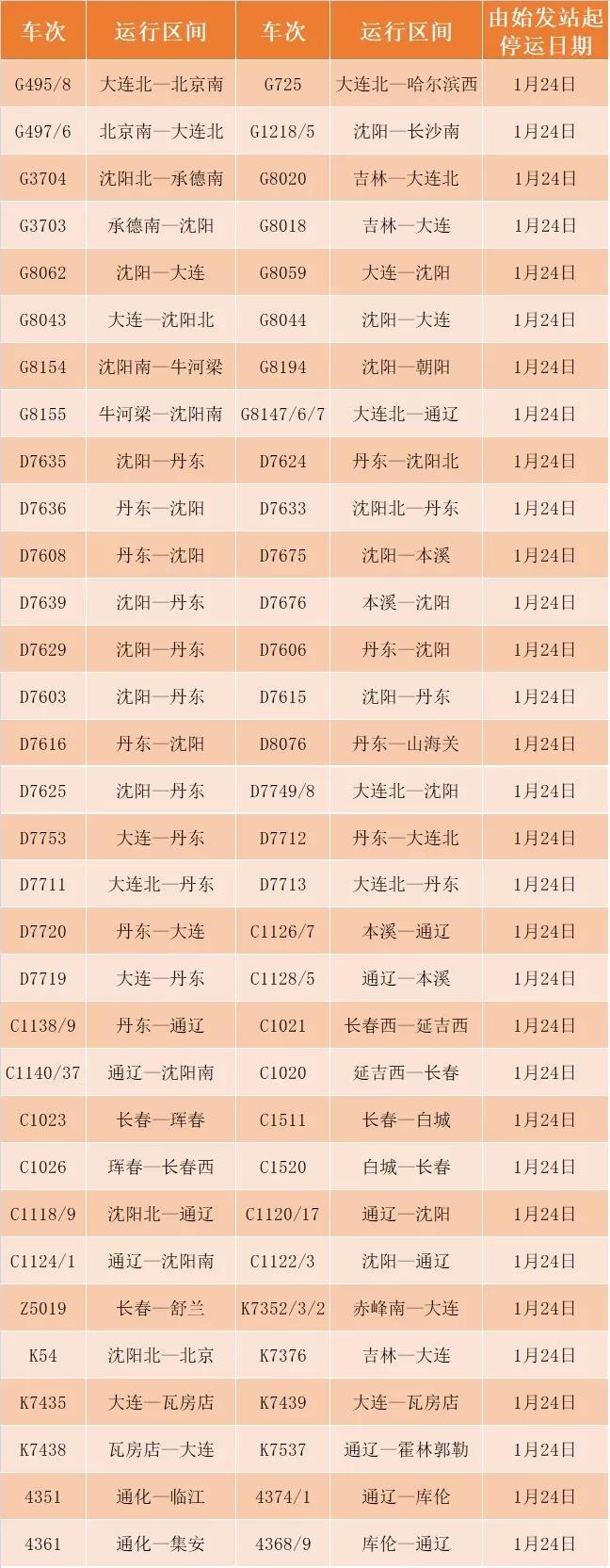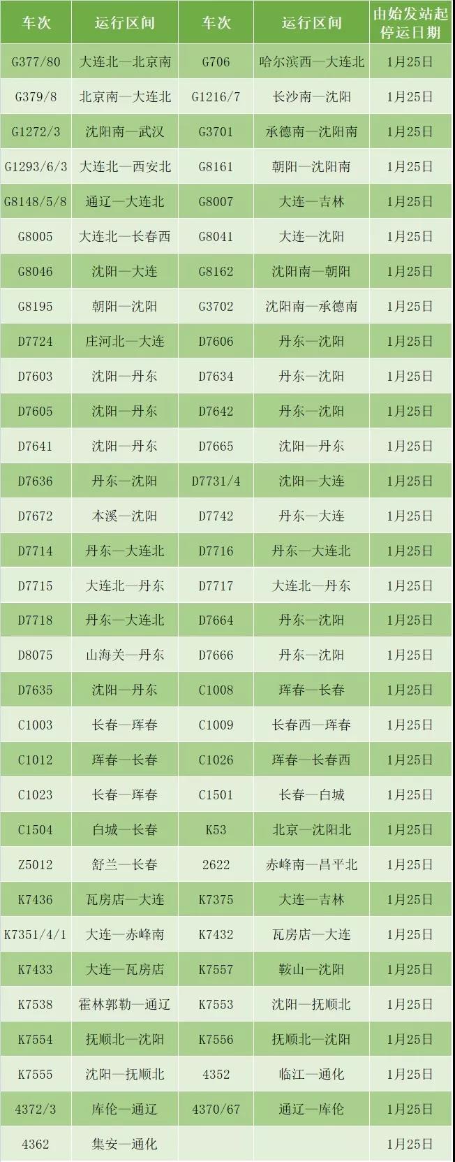 天健网消息(记者 葛春家)由于春节初期客流小,沈阳铁路局集团公司根据市场调研和客流分析,按照往年惯例,停运部分旅客列车,对车辆进行检查维修,其中涉及大连多趟旅客列车停运!春节期间需要出行的旅客,要根据相关信息提前制定好出行计划。