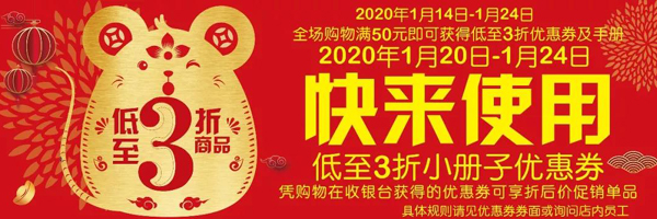 天健网消息(曲静媛 记者 葛春家)2020年1月14日-1月24日,全场购物满50元即可获得低至3折优惠券及手册,2020年1月20日-1月24日快来使用低至3折小册子优惠券!凭购物在收银台获得的优惠券可享折后价促销单品。