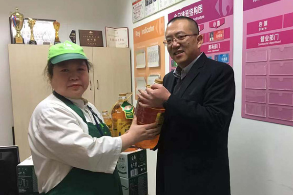 天健网消息(曲静媛 记者 葛春家)春节就快要到了,1月23日,大连家乐福工会来到家乐福各门店,亲切慰问一线职工代表,大连家乐福黄河店店长鹿铁柱、中山店店长李振波、北京公园店店长杨涛、华南店店长郭新华、瓦房店店长戴威分别为一线职工带去了米、面、油等生活用品,为他们的辛勤工作点赞,希望他们过个幸福年,同时希望他们在新的一年中再接再厉,再创佳绩!