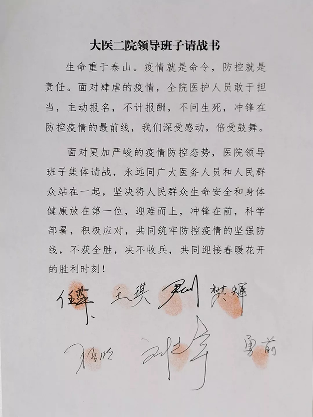 一张张简短的请战书,是最响亮的号角,在疫情面前,大医二院人冲锋在前,真正筑起护佑生命健康的血肉长城。