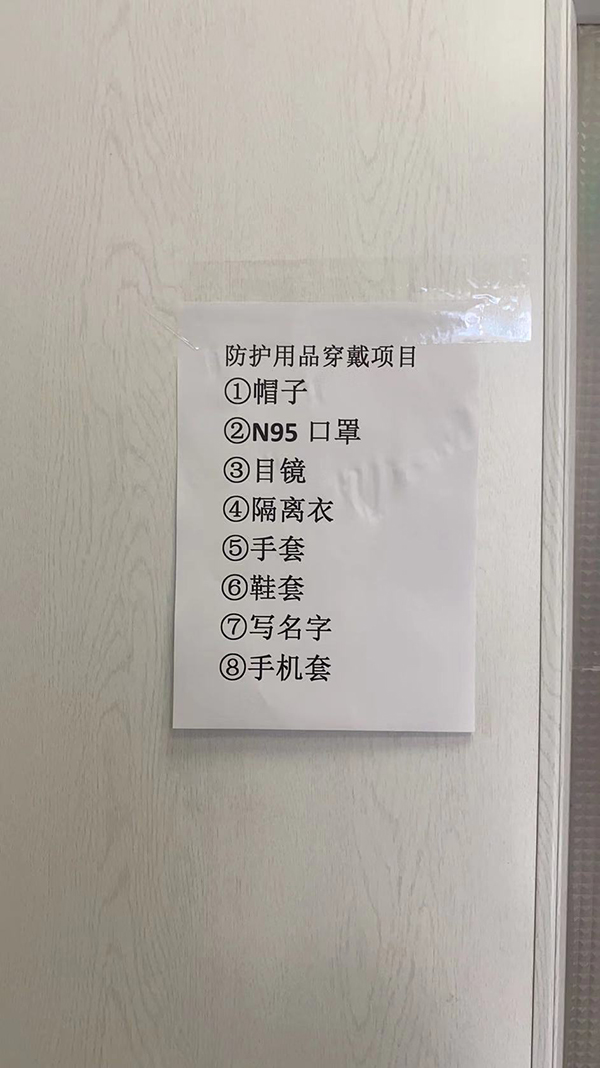朱英为医护人员整理的防护用品项目,贴在墙上随时提醒