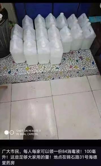 记者了解到,这家药房从1月28日开始就为周边居民免费赠送消毒液和医用酒精了。每位居民可以领取到100毫升消毒液和250毫升酒精。这些医疗物资都是专门筹集而来,其中消毒液还是雇车从外地运来的。除了免费为居民们赠送物资外,药房还给附近的锦云社区赠送了一批医用N95口罩。“大家一定要共渡难关!”药房经营者在自己的微信朋友圈里写道。