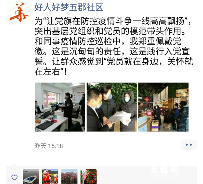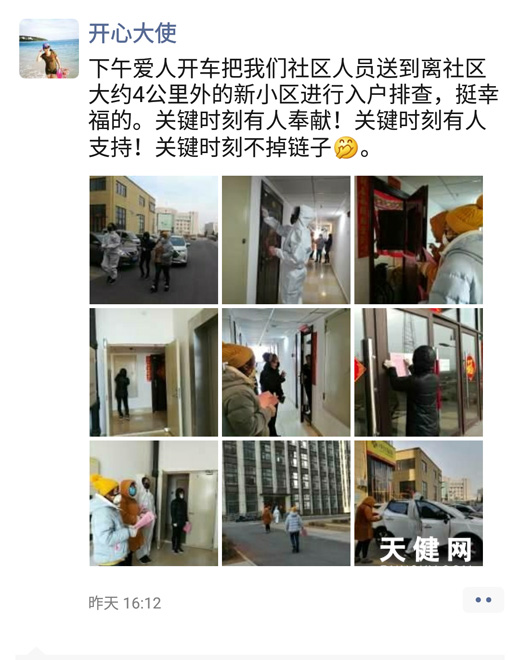 “下午爱人开车把我们社区人员送到离社区大约4公里外的新小区进行入户排查,挺幸福的,关键时刻有人奉献!关键时刻有人支持!关键时刻不掉链子!”