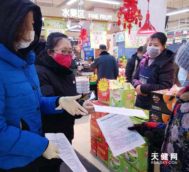 杨瑾在社区菜店对防疫工作进行宣传(左二)