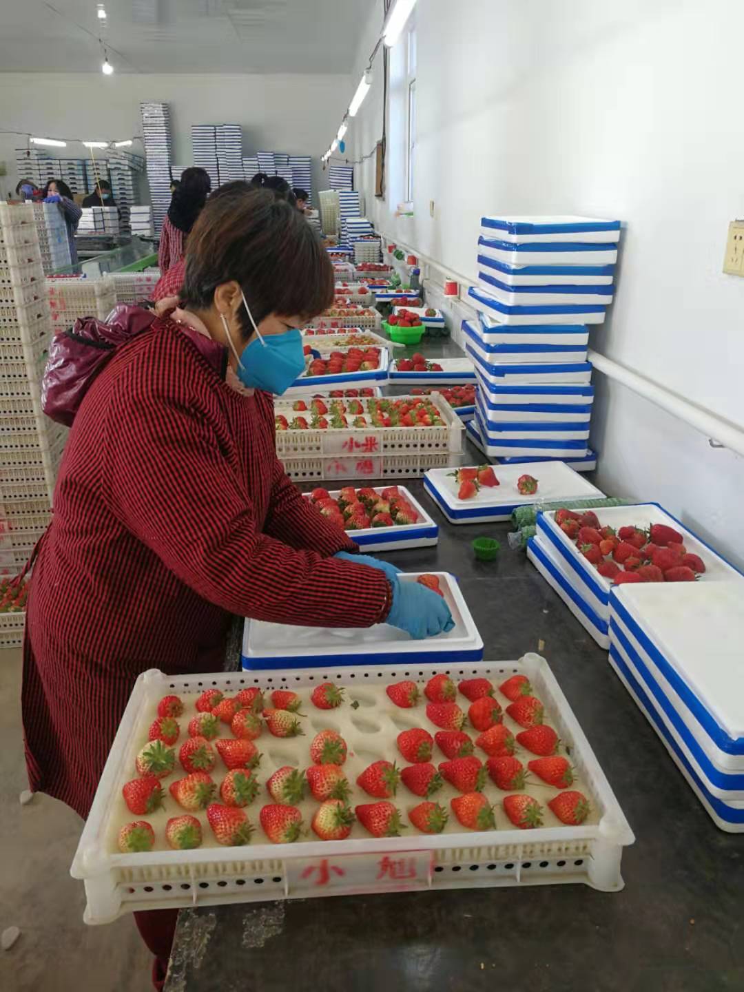 工人在挑拣包装草莓