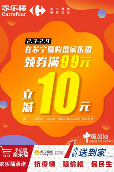 2/3-2/9,宅在家里,上苏宁易购逛家乐福,领张券可享满99元立减️10元,手机购物“零”接触。——贴心!