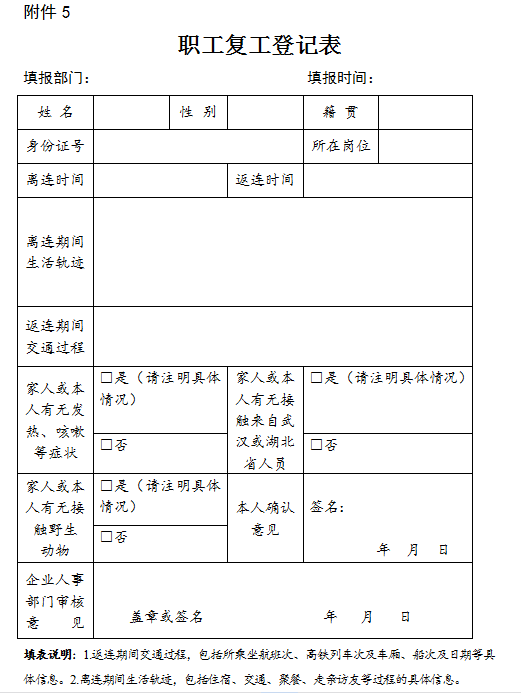 (四)要印制并组织每一名职工如实填写《职工复工登记表》,掌握职工个人及家庭、亲友的疫情相关信息,发现异常情况要按规定立即采取必要措施并向所在地指挥部报告。职工家中若有居家隔离的密切接触者,不得返岗工作。