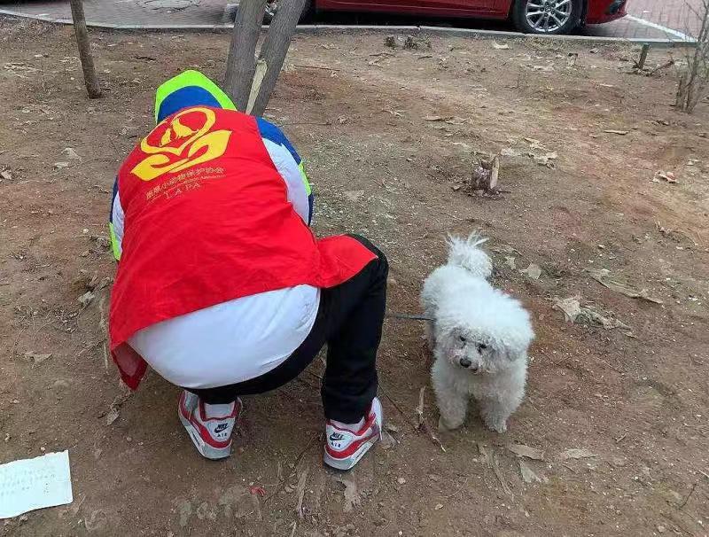 “我们赶到现场时,这只白色小比熊犬正被绳子拴在树上,旁边扔着一袋狗粮。小家伙明显是刚刚遭到主人遗弃,还不时左顾右盼,期盼主人能回来把自己接走。”“花花”说,更令大家心酸的是:当他抱起小狗时,小家伙突然开始后腿直立,用两只前爪不停地向志愿者们作揖拱手,仿佛在祈求收养,又像是在向志愿者致谢。