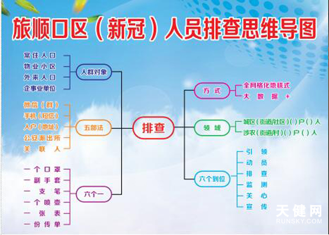 同时,为准确掌握返连人员动态,做好疫情人员筛查和预判,旅顺口区制作了“旅顺防疫”二维码,建立了“一人一表”登记制度,第一时间下发至各街道,要求全区认真做好辖区内人员信息登记,做好防疫筛查,进一步完善旅顺口区疫情人员排查大数据库。同时,利用“思维导图”明晰防疫排查流程。