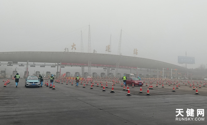 2月10日早上9时许,记者来到后盐高速大连收费站,记者在收费站广场上看到,整个收费站浓雾弥漫,入市方向车辆较少。工作人员对来连人员进行测温并进行信息登记。