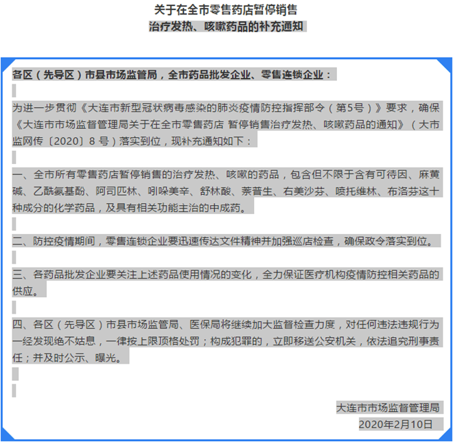 天健网消息(大连新闻传媒集团记者 金东淑)刚刚,大连市市场监督管理局刚刚下发全市零售药店暂停销售治疗发热、咳嗽药品的补充通知。