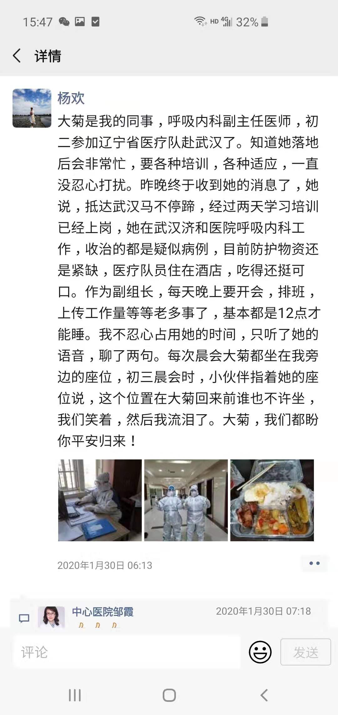 王利菊是友谊医院呼吸内科副主任医师,私下里杨欢叫她“大菊”。初二参加辽宁省医疗队赴武汉。抵达武汉马不停蹄,经过两天学习培训上岗。她在武汉济和医院呼吸内科工作,收治的都是疑似病例。作为副组长,她每天晚上要开会,排班,上传工作量等等,基本都是晚上12点才能睡。杨欢不忍心占用她的时间,只听听她的语音,聊两句。