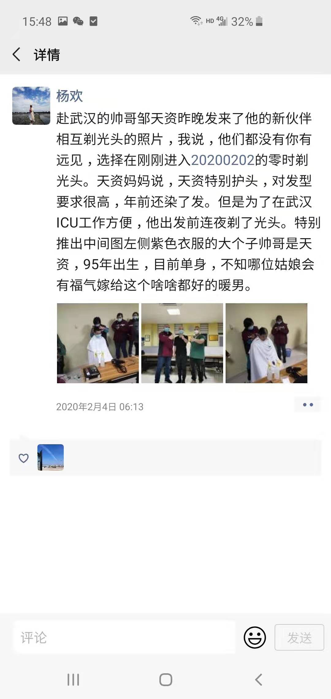 2月2日,杨欢写道,又有两位ICU的护士今晨赴武汉了。一位是ICU的大眼睛护士长王梓芳,一位是帅哥男护邹天资。他们半夜在睡梦中接到出发的通知,天资马上起床,做的第一件事是给自己剃了光头,这是为了进ICU穿隔离医打理方便。到了武汉,才发现男医生互相理发已成“新时尚”,天资的妈妈说,儿子其实特别在意发型,年前还染了头发。可为了工作二话不说就剪。杨欢在朋友圈发他的光头帅照,特意介绍这位暖暖的大男孩是95后,还是单身哦,哪个姑娘要是嫁了他可有福气了。不光是男同志,奔赴武汉的女医生,女护士也纷纷剪掉长发,为了安全,为了方便。