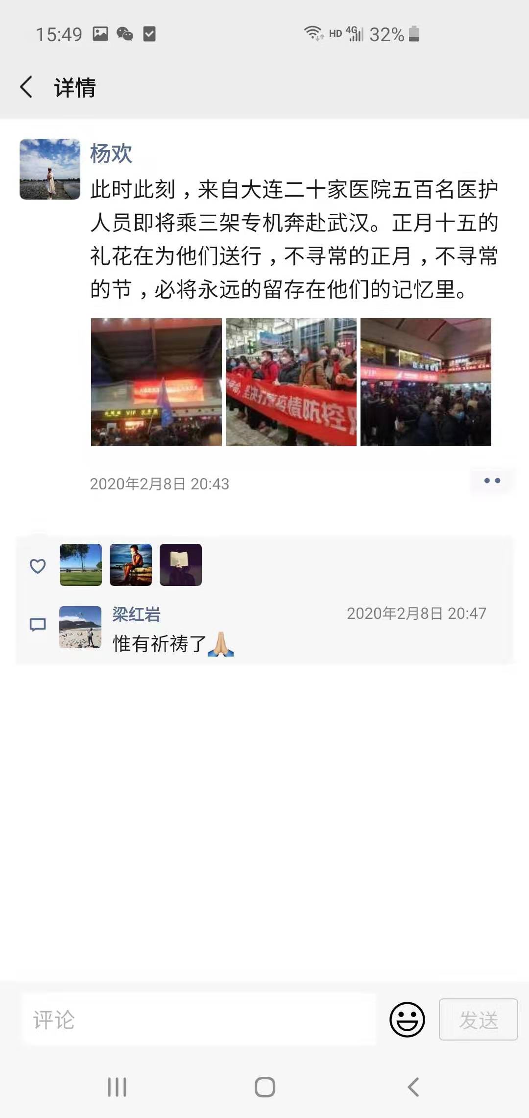 杨欢的朋友圈里记录着,大年三十的晚上去医院拜年,大年初二,春节的气氛在医院里戛然而止,她再次去医院,是去给第一批驰援武汉的同事们送行。大年初三,全院职工停止休假,全员上班。这在大连市的其他医院也是如此。从这一天开始,越来越多的医护人员们逆行,加入抗战病毒的大军。