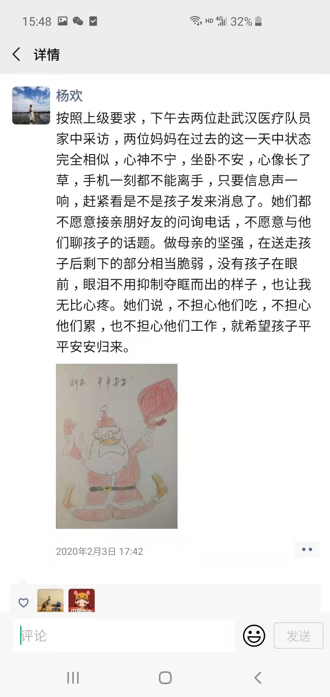 几张照片,配上前方战士们实时的动态,杨欢觉得自己有义务记录发生在医护人员身边的事,哪怕是小小的细节。前方的战士通过微信和后方的同事们聊着琐事、心情,他们就这样对着手机开玩笑、互相打气,也有睡不着的时候默默地看着等待朋友圈里的新动态,也有忍不住的流泪。