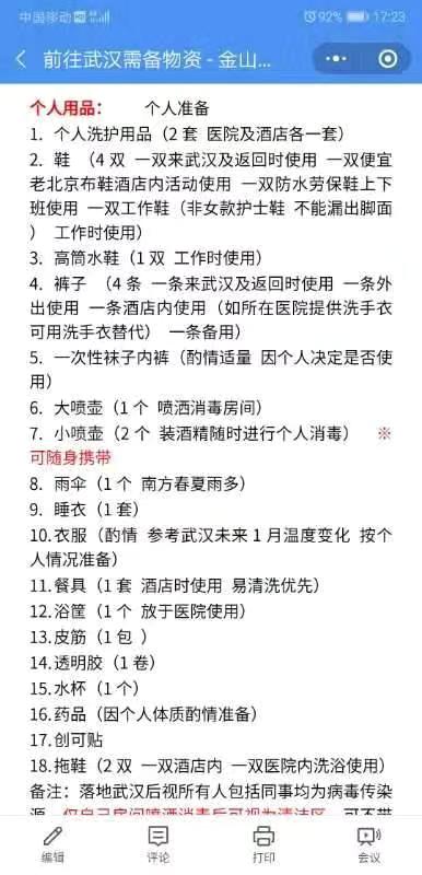 2月8日,这是大连人无法忘记的一天,在正月十五阖家团圆的日子里,我们大连派出500人医疗队伍驰援武汉。那一晚朋友圈刷屏了,大连人为他们骄傲,也为他们担心着。而在杨欢的朋友圈里则有着更加具体的细节。那是一份采购清单,采购者是骨科护士长梁怡。下午四点接出征通知,六点医院集合,大部分队员是来不来及现买东西的。梁怡问询了前两批赴武汉队员后,冲到家乐福找到值班经理说明情况。经理一听,带着她一路小跑往购物车里捡。喷壶脱销了,创可贴没有了,医院里的同事们帮着装箱,整理物品,嘱咐的话说也说不完。