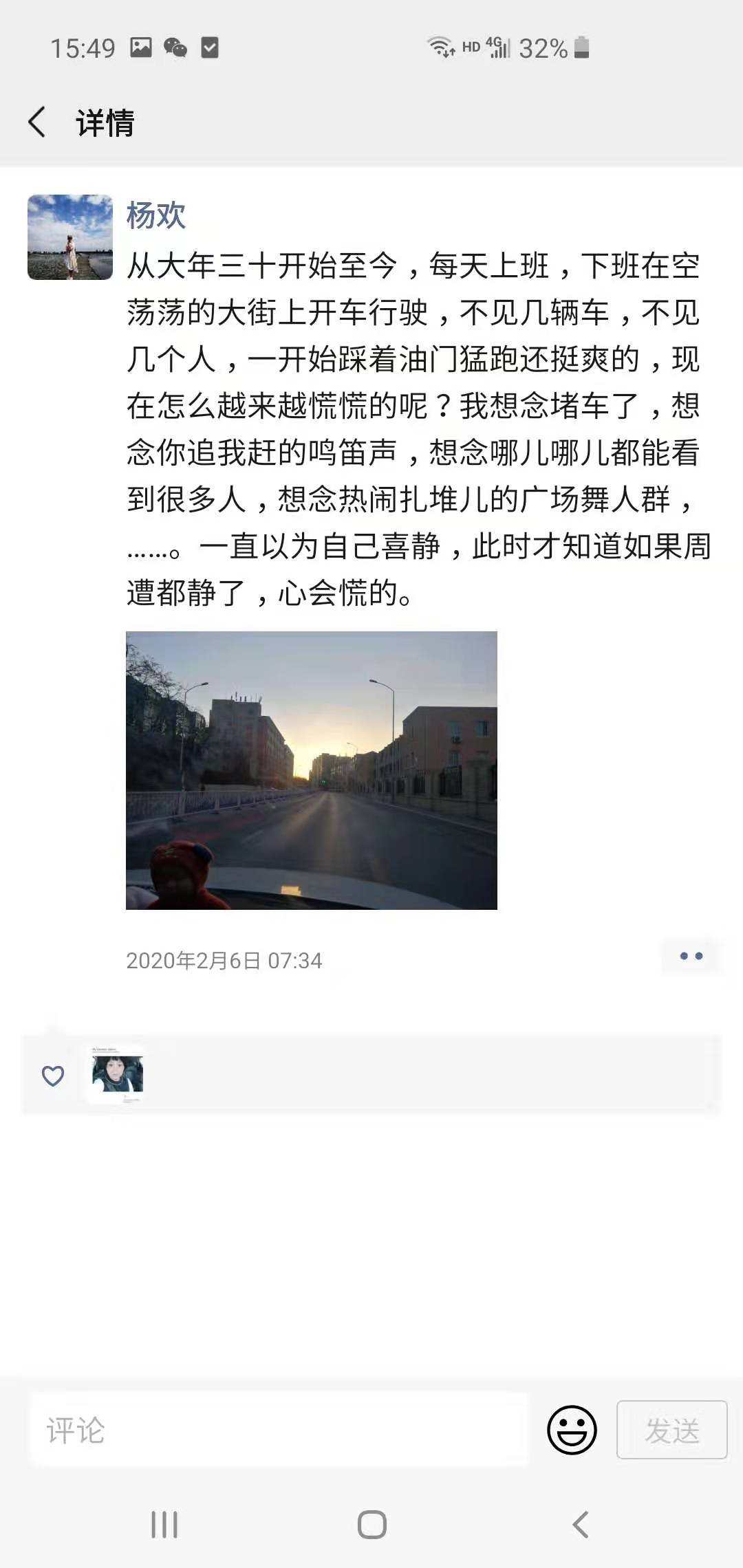 2月6日,杨欢的朋友圈里有这样一段话:“从大年三十开始至今,每天上班,下班在空荡荡的大街上开车行驶,不见几辆车,不见几个人,一开始踩着油门猛跑还挺爽的,现在怎么越来越慌慌的呢?我想念堵车了,想念你追我赶的鸣笛声,想念哪儿哪儿都能看到很多人,想念热闹扎堆儿的广场舞人群……一直以为自己喜静,此时才知道如果周遭都静了,心会慌的。”这大概是很多人的心声,现在我们好想看到广场上彪悍的大妈们随着土嗨音乐蹦跶,好想听见楼下的大爷大叔对着一步象棋争论不休,好想去地铁挤一把。疫情什么时候才能过去呢?会的!一定会的!