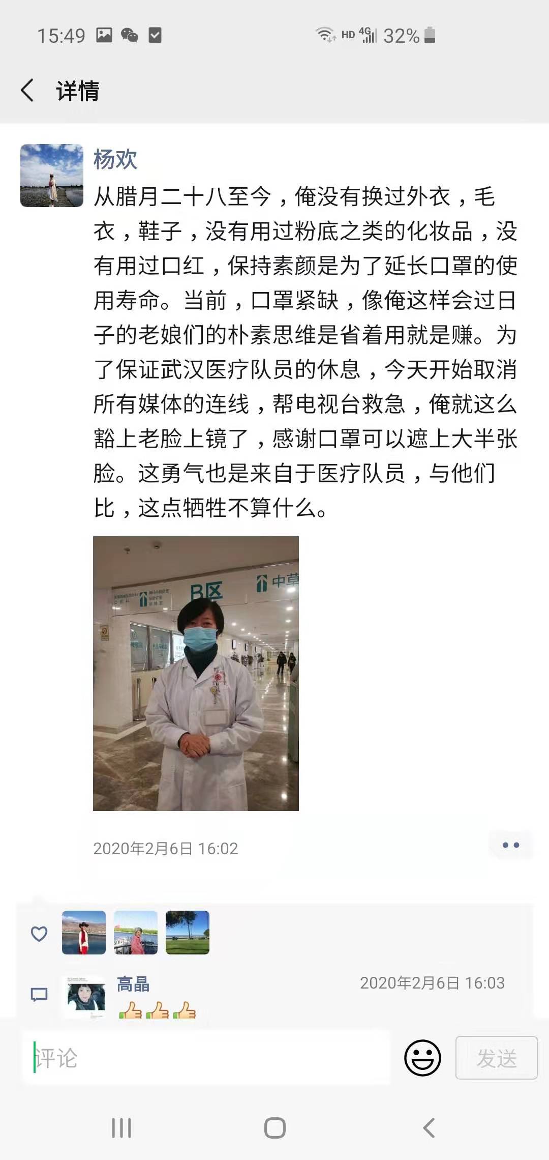 记者眼前的杨欢一直在忙碌。她说,她会一直关注在武汉抗疫一线的战友们,她朋友圈里的战疫现场,还会时时更新中……