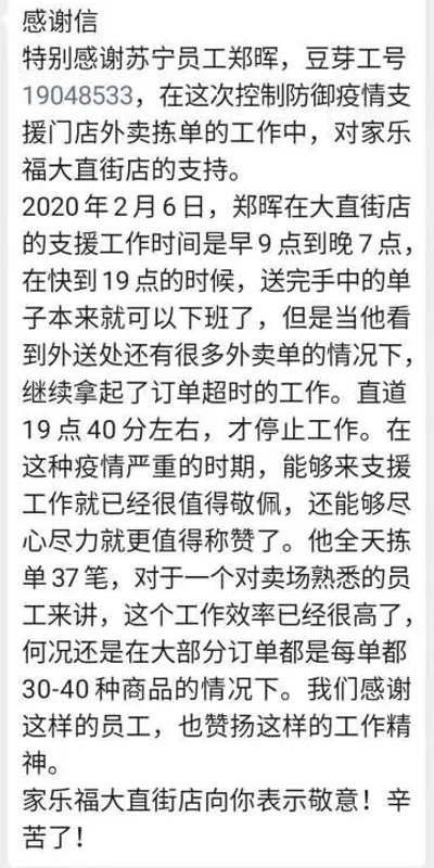 郑晖在门店的努力工作大家都看在眼里,国展家乐福大直街店还专门写了一封感谢信对小伙子进行了表扬。